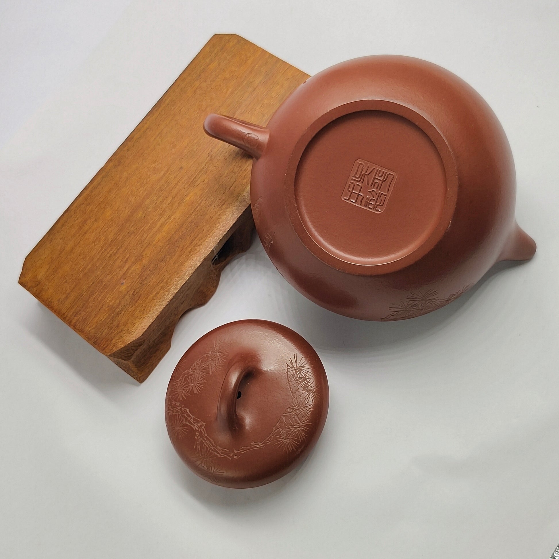 Master Yin Jiaji hand-made carved pine teapot in red skin dragon persimmon garden.